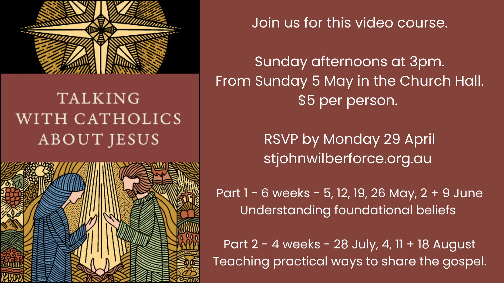 The course begins Sunday 5 May. We will meet for six weeks at 3pm in the Church Hall. The second part, four weeks, will be done in term 3.